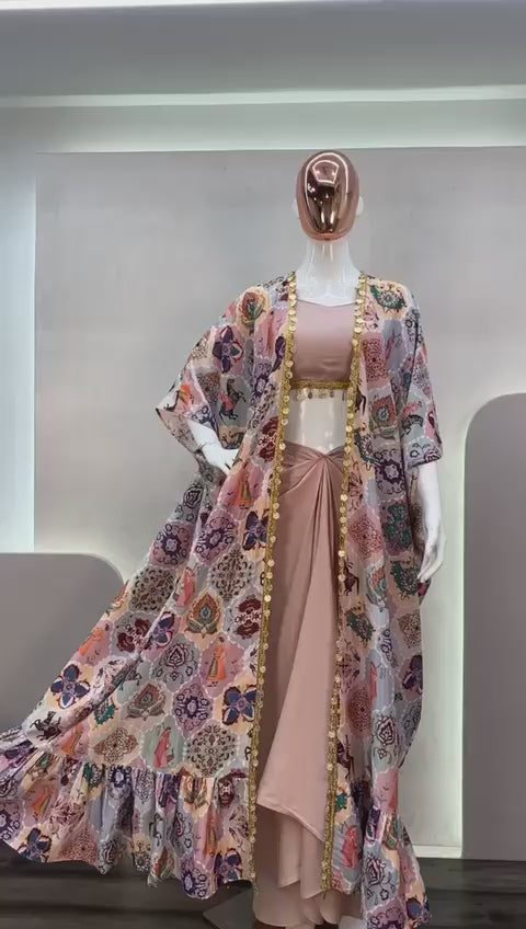 Make a bold style statement with this Designer Indo-Western Set crafted from premium Fiona Silk. The ruffle-style printed Koti is adorned with delicate coin lace work, exuding a perfect blend of ethnic charm and modern flair. Paired with a stylish full-stitched western bottom in matching fabric, and a coordinating Fiona Silk choli with coin lace (unstiched for customization), this outfit offers comfort and glamour in one. Ideal for summer weddings, festive gatherings, and fusion events.